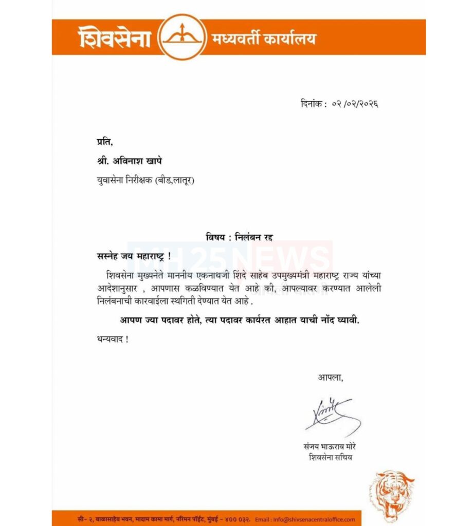 MH 25 News वरील बातमी प्रसारित झाल्यानंतर अवघ्या काही वेळातच पक्षाने हालचालींना वेग दिला. वाढता दबाव, कार्यकर्त्यांमधील असंतोष आणि जनमताची दिशा लक्षात घेत अविनाश खापे यांचं निलंबन अखेर रद्द करण्याचा निर्णय घेण्यात आला. माध्यमांची ताकद पुन्हा सिद्ध