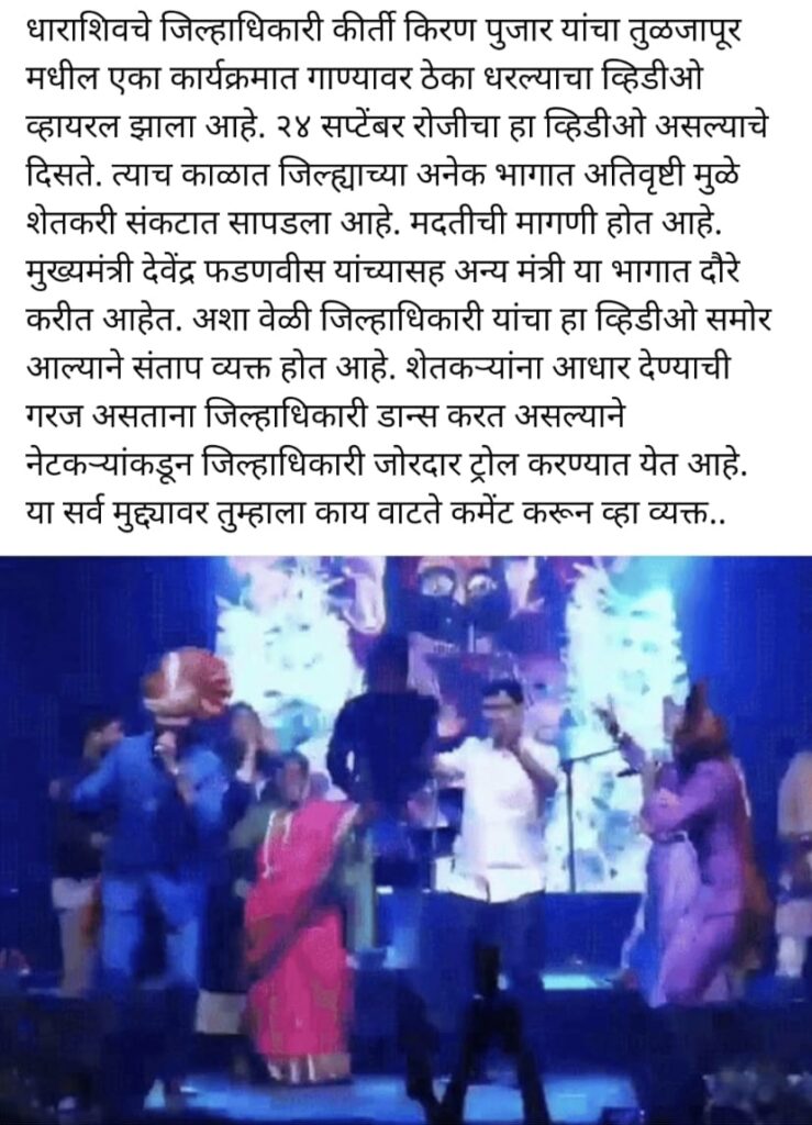 धाराशिव – धारशिवच्या जिल्हाधिकाऱ्यांचे डान्स प्रकरण काही थांबण्याचे नाव घेताना दिसत नाही. व्हायरल व्हिडिओवरून जिल्हाधिकारी किर्ती किरण पुजार हे चर्चेत आले आहेत. डान्स व्हिडिओ वरून टीका होऊन राजकीय पडसाद देखील उमटू लागले आहेत. अशातच आता एका निवृत्त पत्रकाराने जिल्हाधिकाऱ्यांना ठरवून टारगेट केलं जात असल्याची पोस्ट शेअर करत एकच खळबळ मजवून दिली आहे.