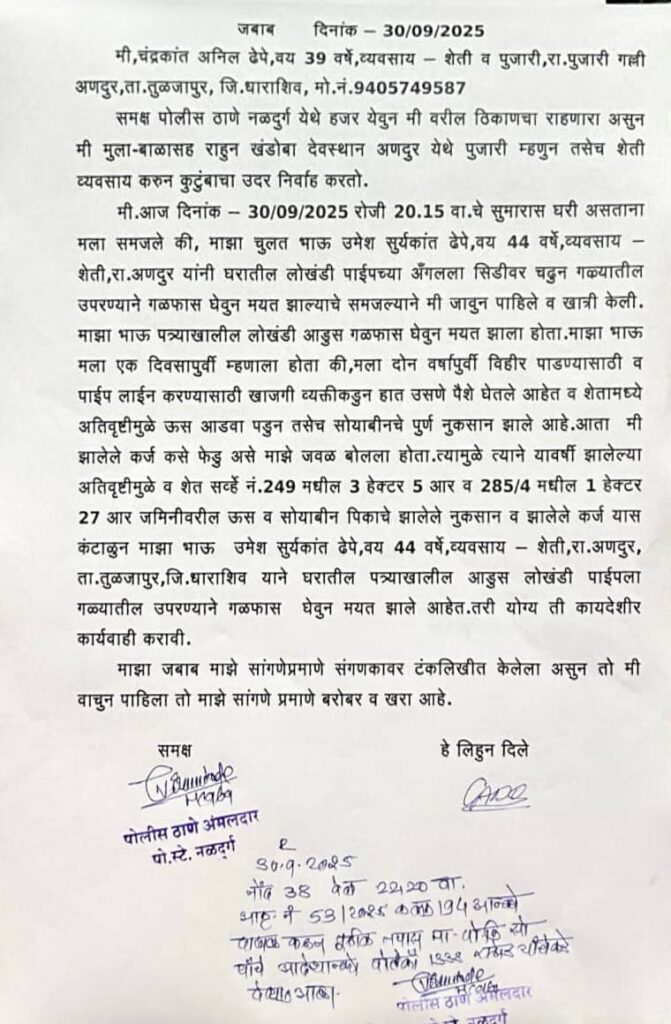 तुळजापूर – तालुक्यातील अणदूर येथील एका तरुण शेतकऱ्याने अतिवृष्टीमुळे झालेल्या पीक नुकसानीमुळे आत्महत्या केल्याची हृदयद्रावक घटना घडली आहे. उमेश सूर्यकांत ढेपे (वय ४५) असे या शेतकऱ्याचे नाव असून, त्यांनी मंगळवारी सायंकाळी आपल्या राहत्या घरी गळफास घेऊन जीवन संपवले. या घटनेमुळे संपूर्ण गावावर शोककळा पसरली आहे.