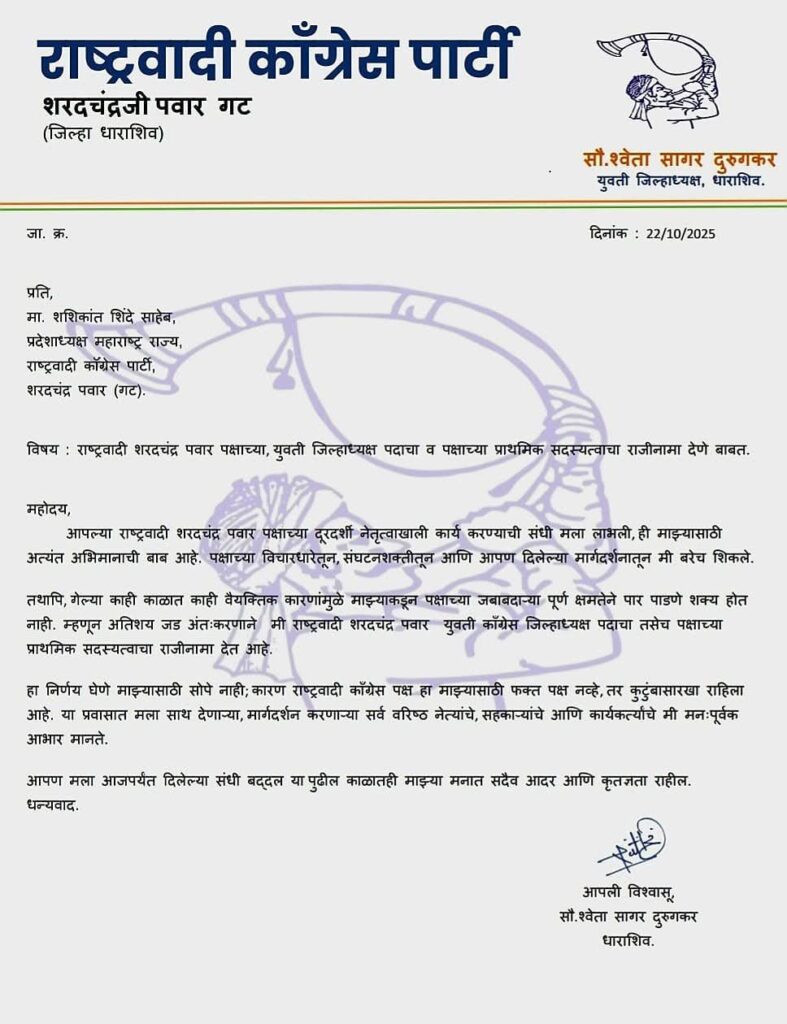 अशातच आता शरद पवार गटाला धाराशिव मध्ये धक्का असून युवती पदाधिकारीने राजीनामा दिला आहे. श्वेता दुरुगकर यांनी आपल्या धाराशिव जिल्हा युवती जिल्हाध्यक्ष पदाचा राजीनामा सोशल मीडियावर शेयर करत राष्ट्रवादी काँग्रेस शरद पवार गटाला राम-राम केला आहे. पदाचा राजीनामा पक्षश्रेष्ठी तसेच वरिष्ठ पदाधिकारी यांच्याकडे पोहोचतो ना पोहोचेपर्यंत श्वेता दुरुगकर यांनी ठाकरे सेनेत प्रवेश केला. या पक्षप्रवेशामुळे पुन्हा एकदा महाविकास आघाडीमध्ये मित्र पक्षानेच मित्र पक्षाचा पदाधिकारी आपल्या पक्षात घेतल्याने महाविकास आघाडीमध्ये बिघाडी होते की काय अशी राजकीय वर्तुळात चर्चा सुरू झाली आहे.